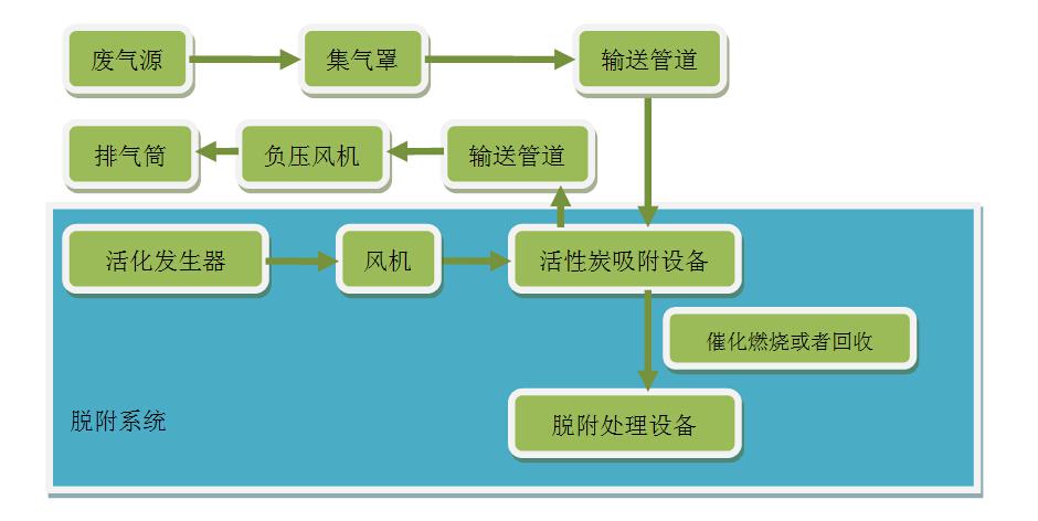 活性炭吸附脫附系統(tǒng):利用整套系統(tǒng)能夠更好地發(fā)揮活性炭設(shè)備的優(yōu)勢。其流程如下。